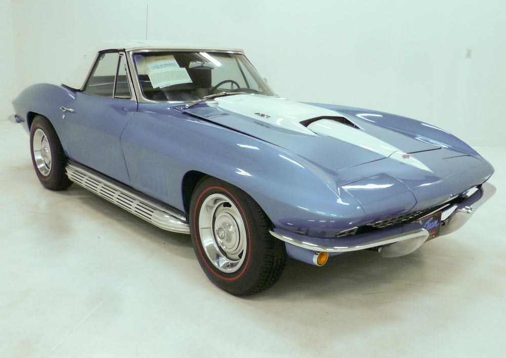 1018U..1967 Corvette Convertible with Two Tops, 427-435 hp, 4 speed, numbers matching original motor, transmission and rear end, also has factory original body/trim tag. Ermine White paint with Bright Blue stinger, Bright Blue interior, and Blue soft top. Rare documented color combination that has been body-off restored and subsequently shown earning the Bloomington Gold certification and multiple NCRS Top Flight awards. NO HIT GM front end with grill tab in place. Paint has aged gracefully but has some checking. The standard bore motor was also rebuilt during restoration. Also has an affirmation by CCAS/Grenning as to the legitimacy and originality of the engine block, stamp pad, and the engine stamp. Optioned with factory side exhaust (born with), headrest seats, transistorized ignition, black vinyl auxiliary hardtop, M-21, 4.11 posi, SS brakes, AM/FM radio, tinted windshield, Kelsey B.O. aluminum wheels and your choice of 7.75x15" vintage red stripe tires or modern white stripe radials. Most all factory correct type components including the spare, jack, jack tools, clear floor mats, seat belts, washer system, shifter, shielding, braided wires, air cleaner, alternator, distributor, hoses, hose clamps, carbs, starter, valve covers, radiator, five Kelsey B.O. aluminum wheels, gas door assembly, glove box door, owners manual, sales brochure, and T-3 headlights. Documented with the NCRS/GM validated tank sticker, CCAS/Grenning Engine Stamp Affirmation, warranty book/P.O.P., restoration photos/receipts, Bloomington and NCRS judging sheets, NCRS Confirmation of Judging Awards, owners manual packet and multiple 3-ring binders. Also has extensive owner history including John Danos, George Page and Michael Seskin. Just in from the past owner of 25-years. Production date of May 15th, 1967 and delivered new by Rosenthal Chevrolet in Arlington, VA (dealer code 475 in Zone 14) per the official NCRS/GM Shipping Data Records (SDR). Looks, runs, and drives excellent. CC:+2 Consigned to Mecum Kissimmee Collector Car Auction January 15th - 17th, 2026